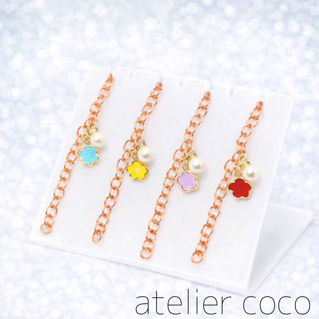 アクセントに花のモチーフとフェイクパールがさらに可愛さとおしゃれさを添えます。