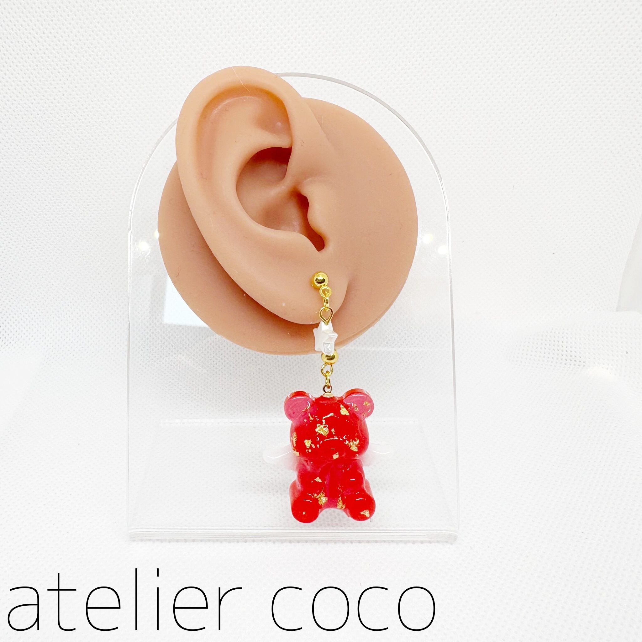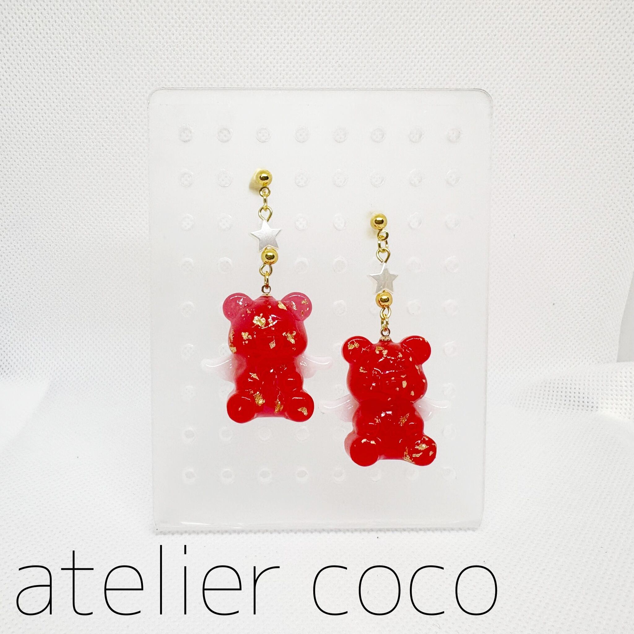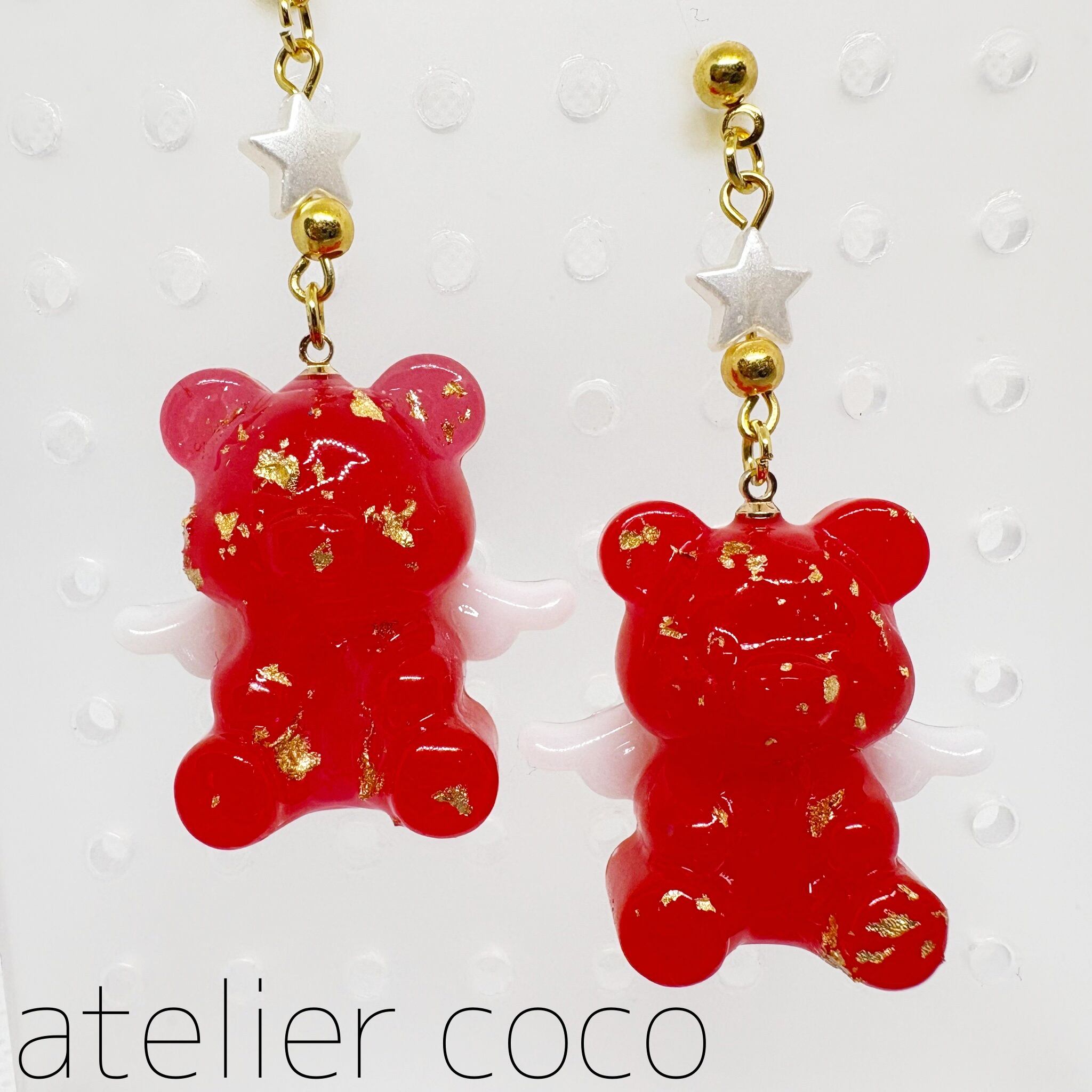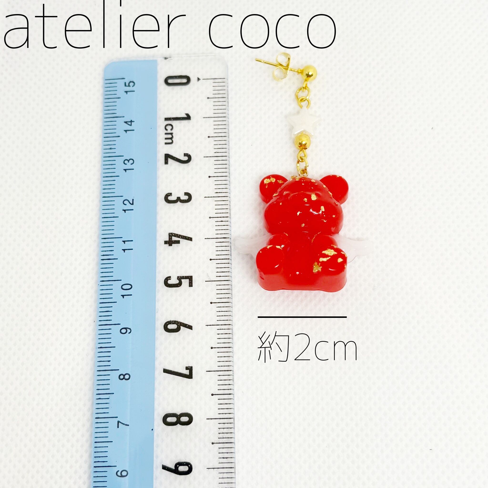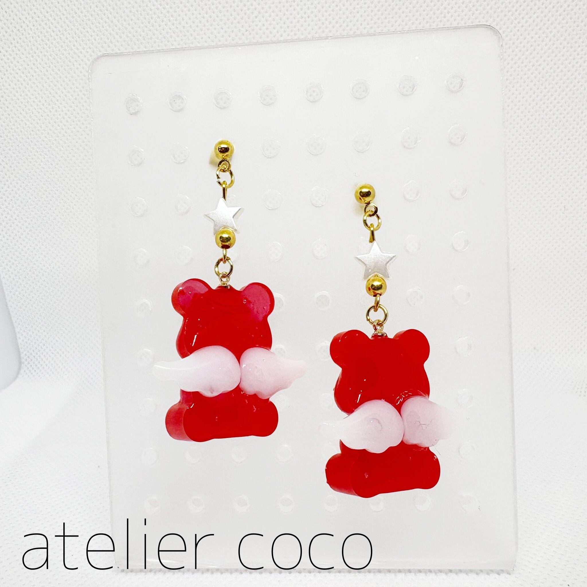 ビビッドな赤が映える翼の生えたくまちゃんのピアスです。
