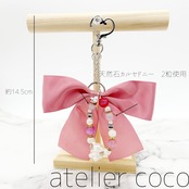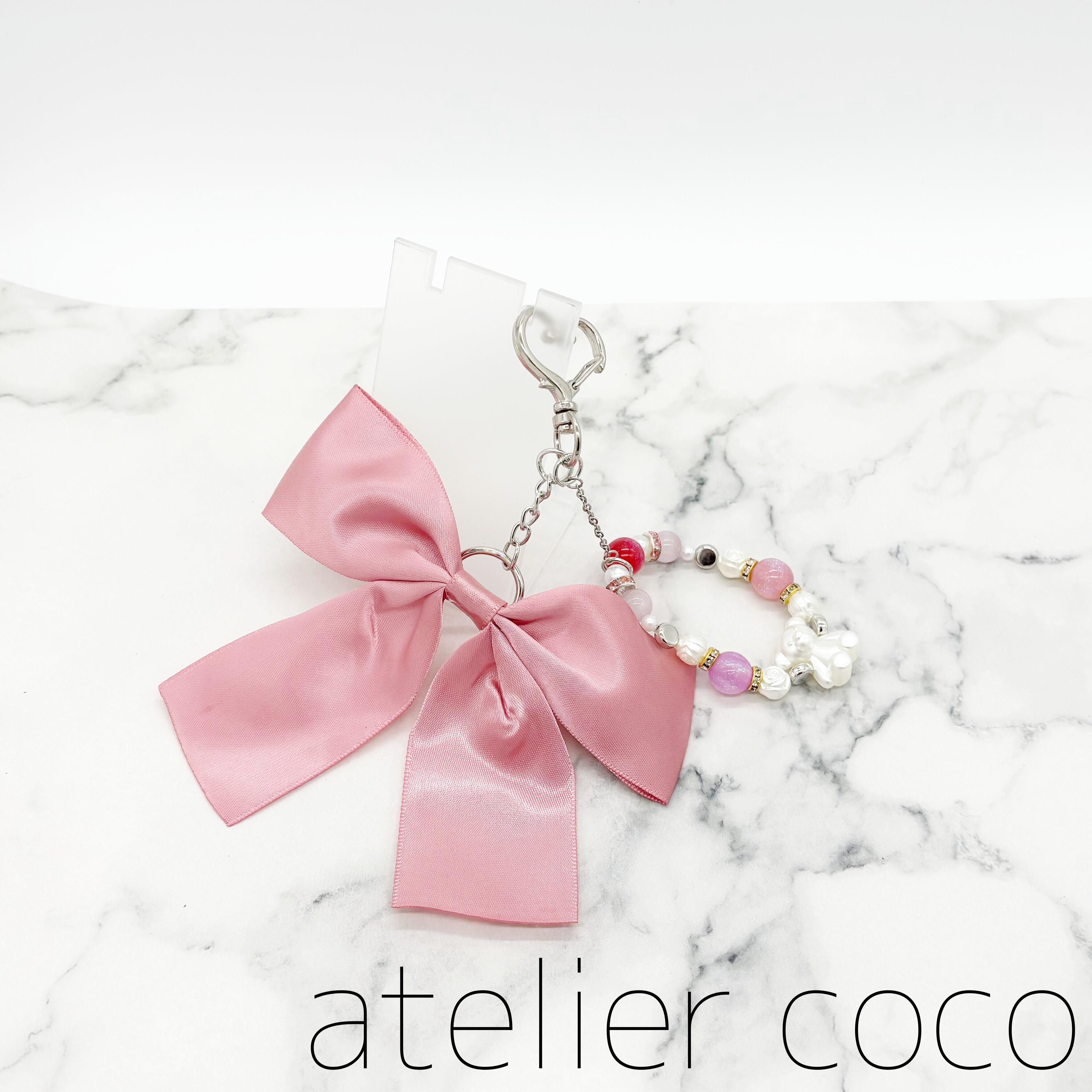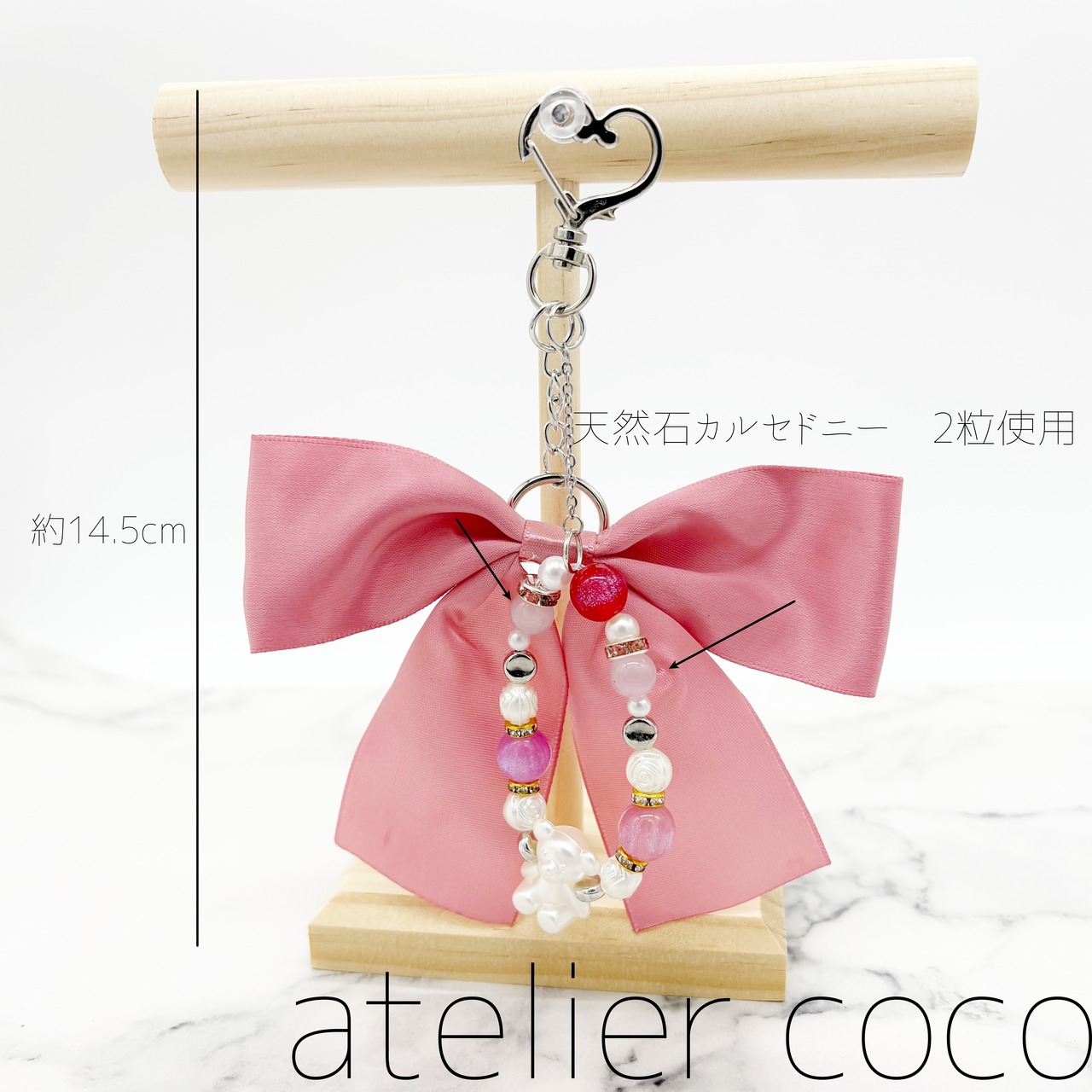 ビッグリボン 天然石カルセドニー使用 ハートキーホルダー ピンク